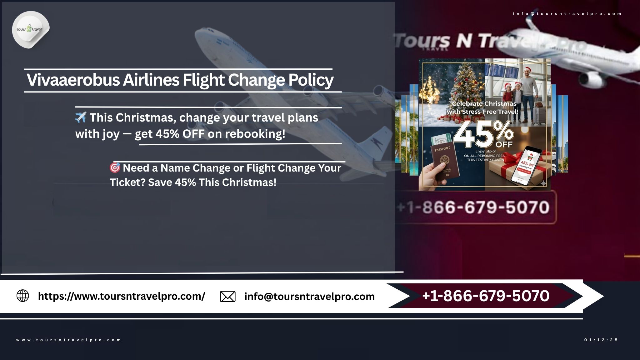 This holiday season, Vivaaerobus Airlines and Tours N Travel Pro are making travel adjustments more affordable than ever. Change your travel plans with joy and enjoy 45% OFF on rebooking! Whether you’re moving a flight for work, family, or leisure, this limited-time offer ensures that your journey is both flexible and budget-friendly.